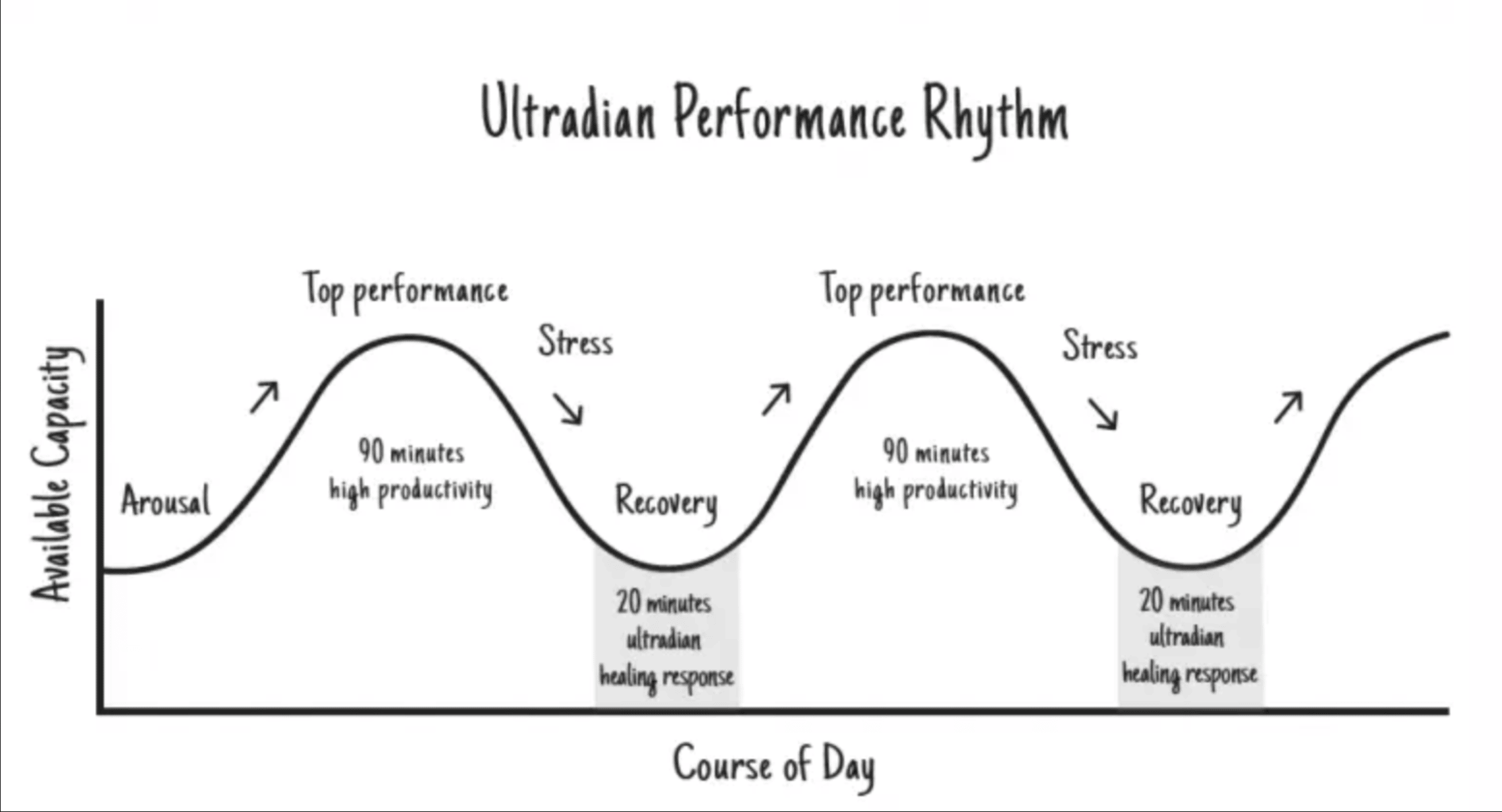 You can see the repeating pattern: about ninety minutes of high output followed by roughly twenty minutes of recovery. Popular tools like the Pomodoro Technique were built on this principle, breaking work into focused intervals followed by rest.